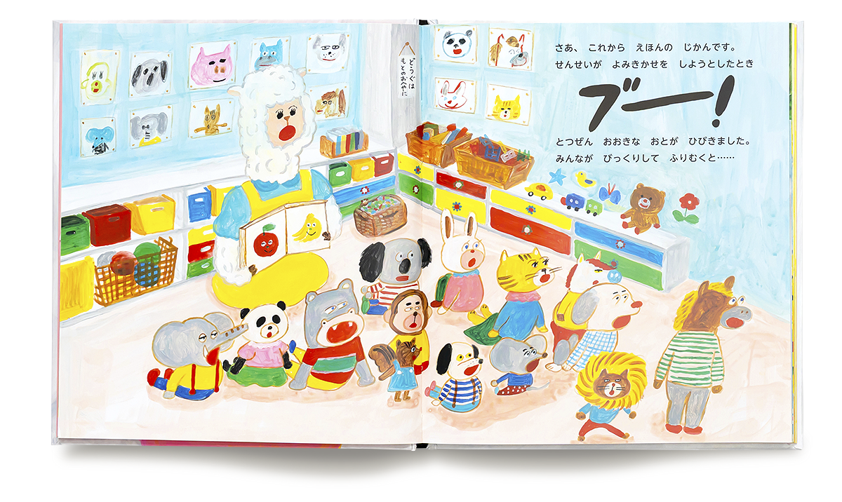 ある日、ぶたすけはかくれんぼをしていると、ほいくえんバスのドアが空いているのに気づきました。「しめしめ」と、バスの中に隠れると、ドアを閉められて出られなくなってしまい…。