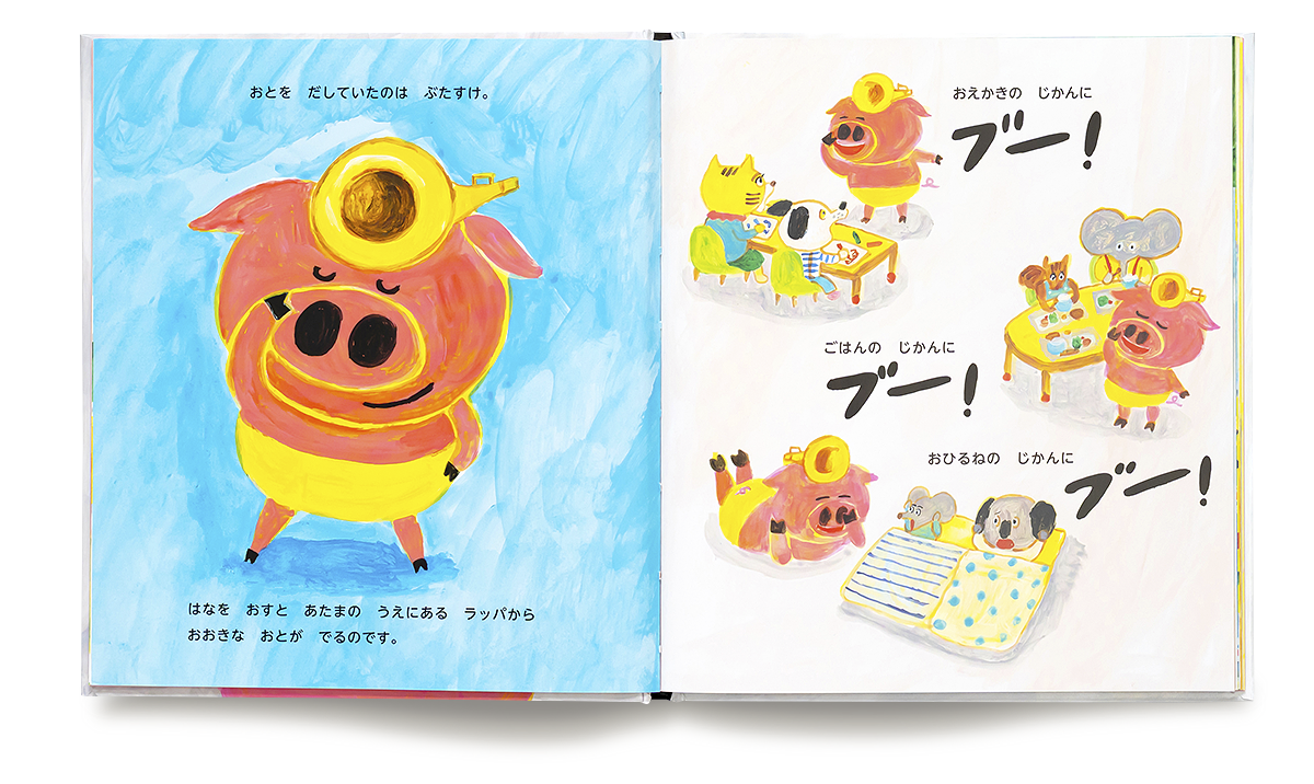 ぶたすけは森のほいくえんに通う、ぶたの男の子。あたまのラッパから「ブー!」と元気な音がでます。おえかきのじかんに「ブー!」、きゅうしょくのじかんに「ブー!」、そしておひるね中にも「ブー!」。保育園の先生に「ぶたすけくんのラッパはくるまのクラクションみたいで、みんなびっくりしちゃうわ」と言われても、おかまいなしです。