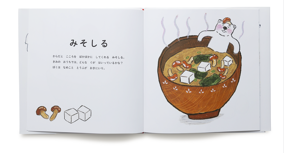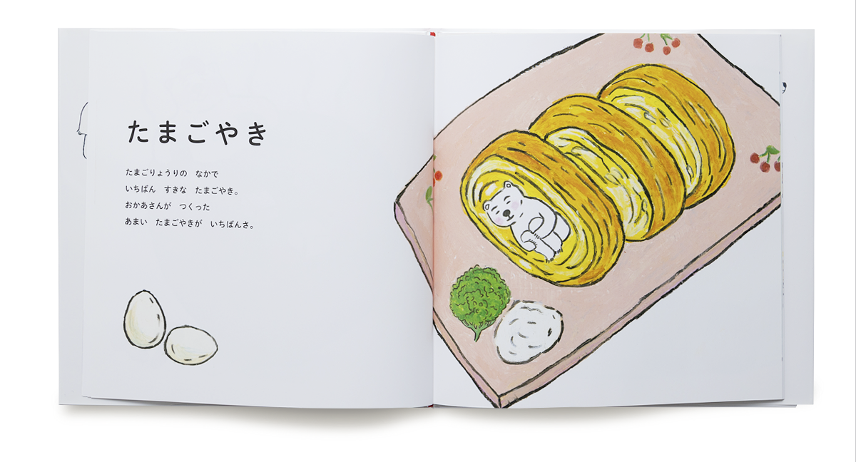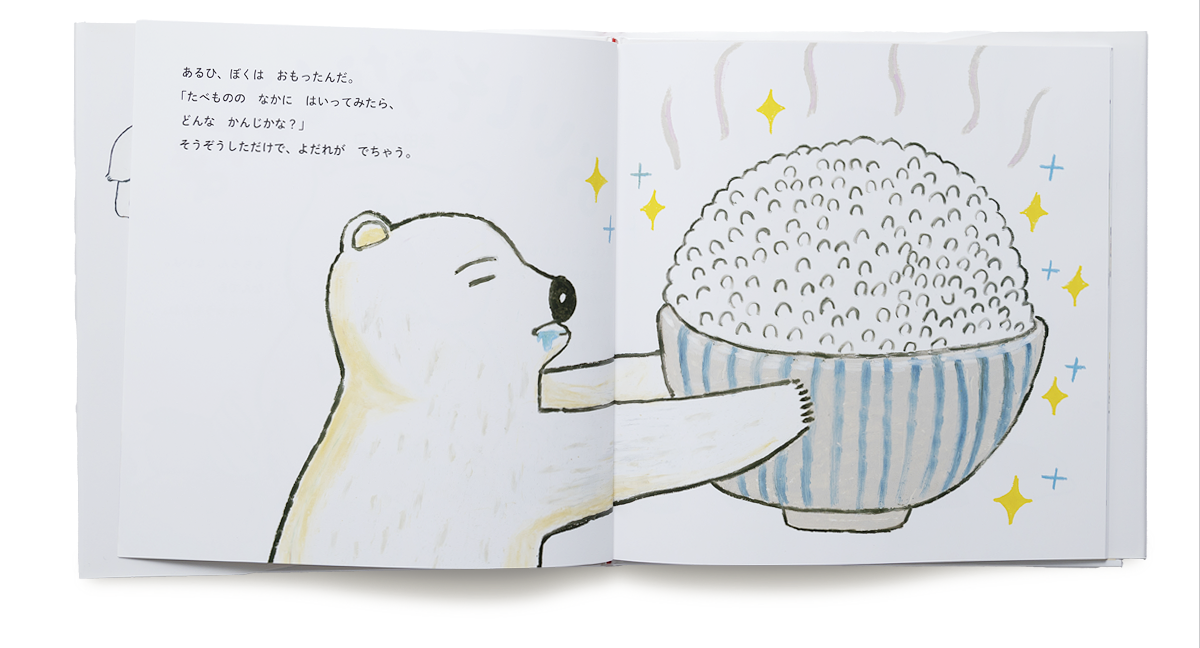 ぼくは、おいしいものをたべるのがだ~いすき。みんなから「くいしんぼうのしろくま」っていわれている。すききらいはもちろんないよ。 ある日、ぼくはおもったんだ。「たべものの中にはいってみたら、どんな感じかな?」そうぞうしただけで、よだれがでちゃう…。